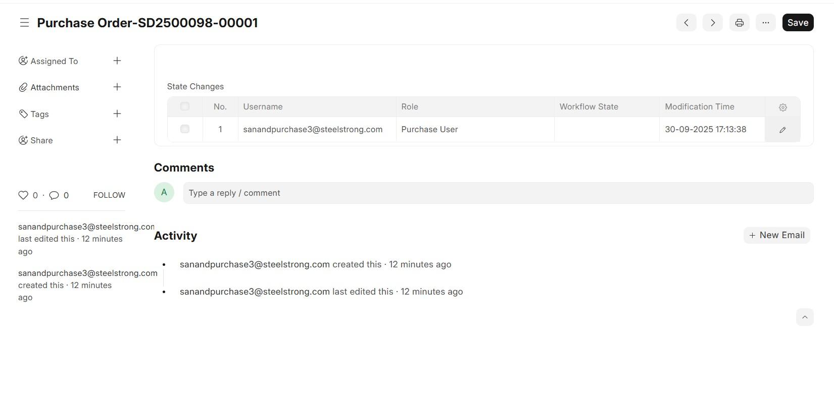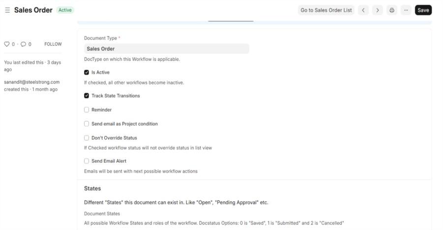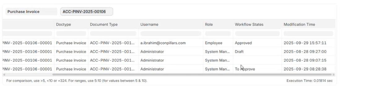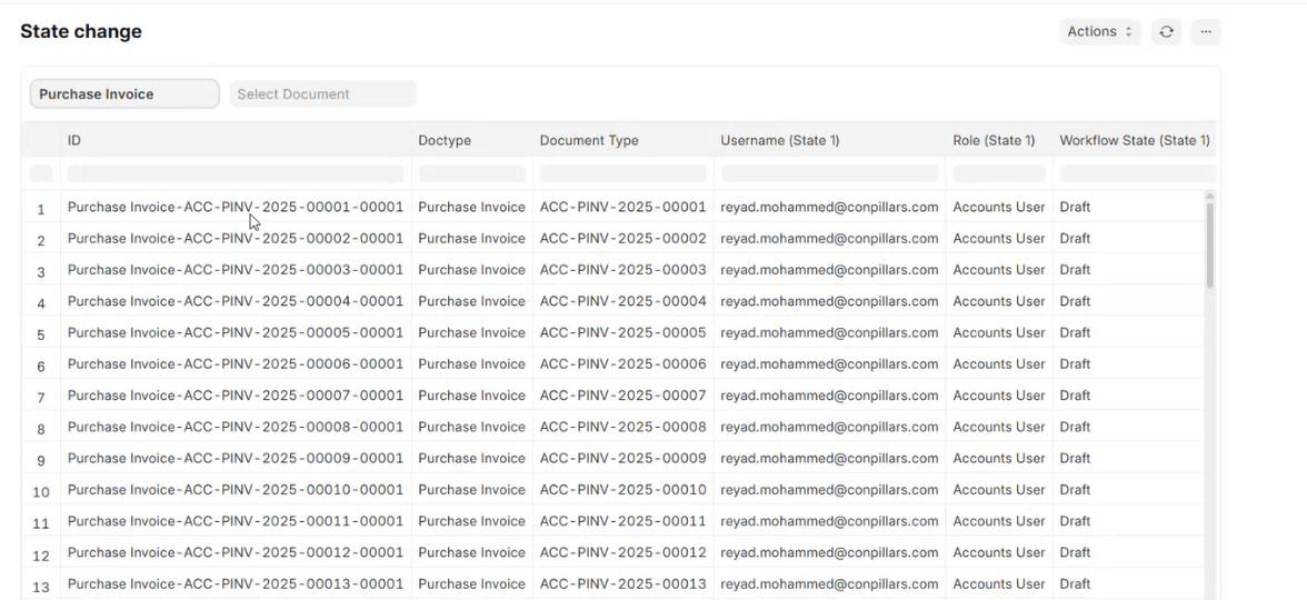 Complete Information: Displays all relevant information about each state transition including user, timestamp, previous state, new state, and document reference